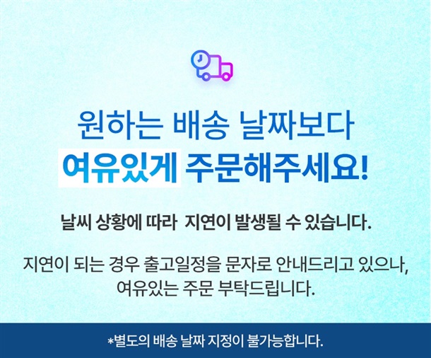 · 단, 기상 및 재고상황에 따라 배송지연이 발생할 수 있습니다.